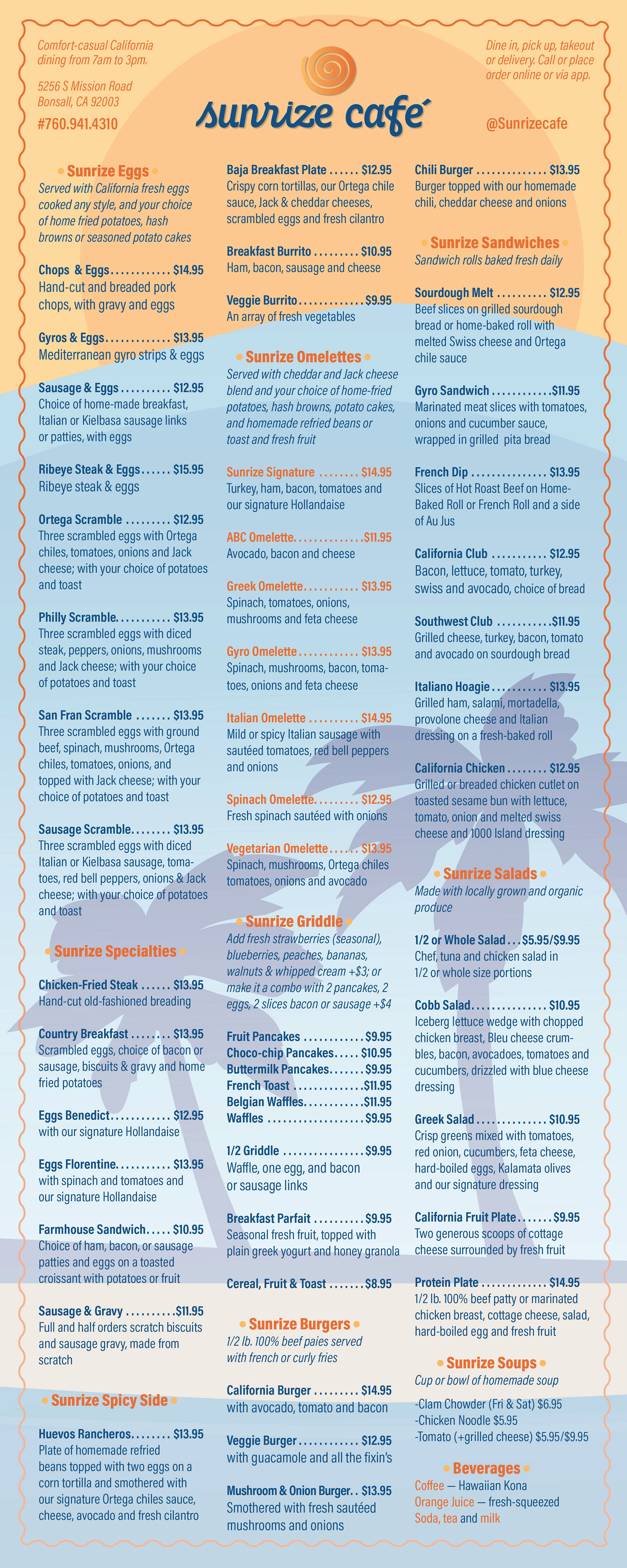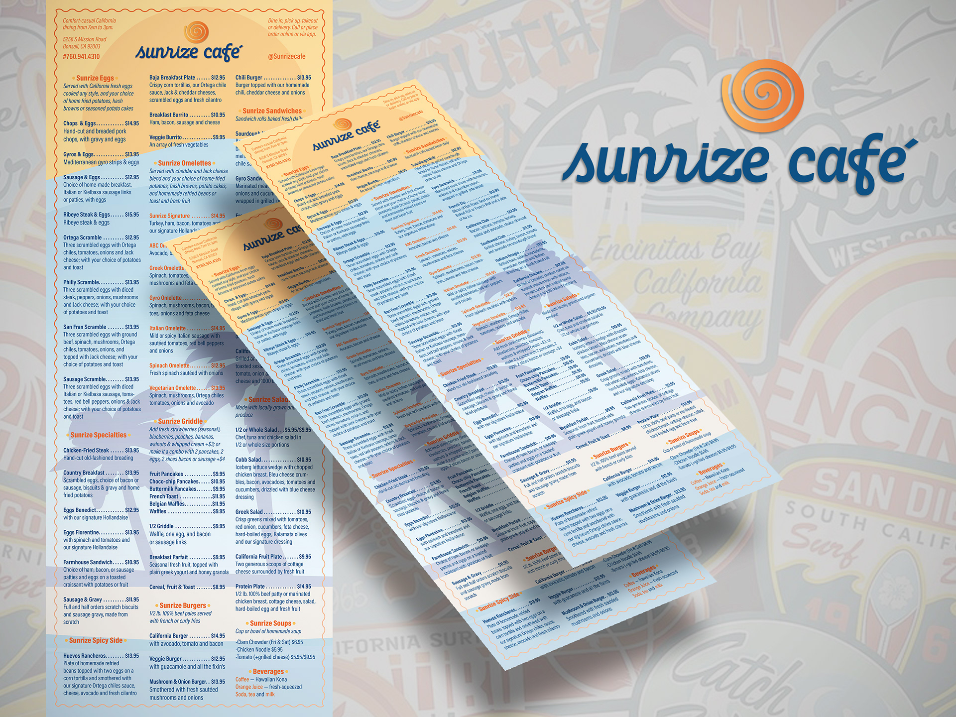 Sunrize Cafe — comfort-casual California breakfast dining in Bonsall, CA (since closed) — logo / branding and menu redesign — vintage California, surfing, surf-and-skate stickers/decals inspired logo and art deco meets popart styling brings this completely new menu to life — with a top-down Z-fold for a simple and fun square menu that expands. Creative Direction, branding, copywriting/copyediting by me; illustration of mountains-beach-scene by Jeff Hobrath.